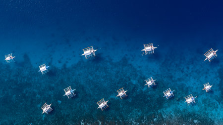 Aerial view of traditional Bangka boats moored above a large tropical coral reef in a calm ocean (Malapascua, Philippines)