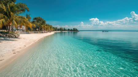 Experience the beauty of a serene tropical beach featuring crystal-clear water, soft white sand, swaying palm trees, and a bright blue sky perfect for relaxation.