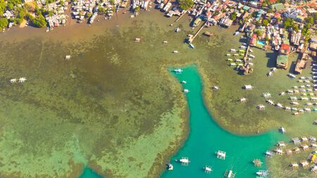 Coast of Cebu island, Moalboal, Philippines, top view. Philippine boats in a blue lagoon over coral reefs. Moalboal is a great place for diving and vacations.