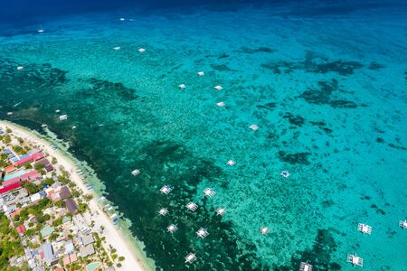 Aerial view of tropica Alona beach on the island Bohol, resort, hotels, Philippines. Beautiful tropical island with sand beach, palm trees. Tropical landscape. Seascape: Ocean, sky, sea. Travel concept.