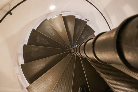 View up to very high and light spiral staircase inside high and old renovated lighthouse next to sea