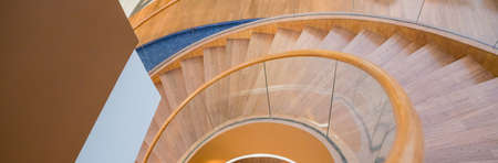 wooden stairs from house interior.spiral stairs in modern designer building.A view down a stairway.Wooden staircase. Web banner