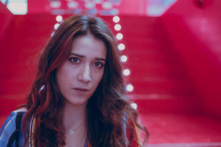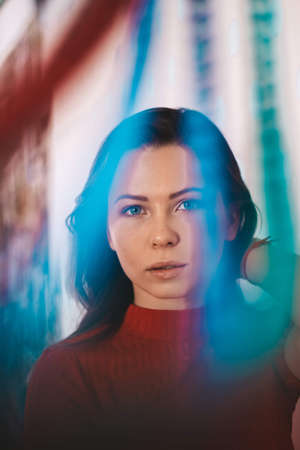 photo of beautiful woman with mixed red and blue lighting , generative AI