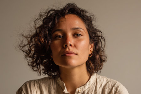 Curly-haired person gazes intently at the camera, wearing a light, buttoned shirt. Gold hoop earring is visible. The lighting is warm, highlighting facial features softly