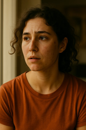 A woman with curly hair stands still, facing the camera in a dimly lit setting. The background shows a rough textured wall. She has a thoughtful expression on her face.