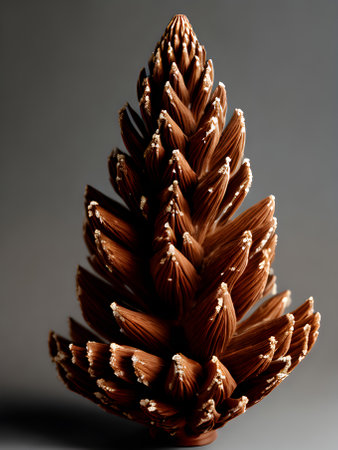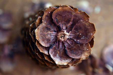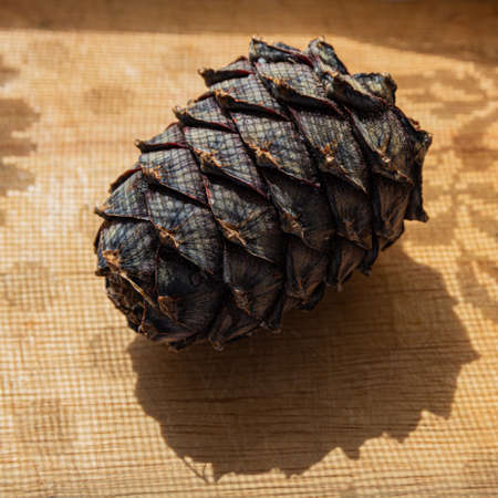 One ripe pine cone with nuts is set against a brown background. The cedar cone has sharp mesh-like shadows