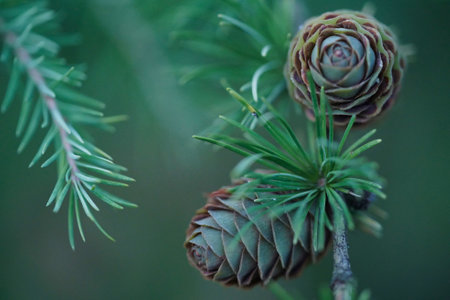 Macro photo of young green fir cones on a branch, selective focus, copy space
