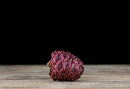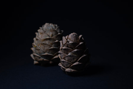 Fir cones fallen from trees. Brown dry buds are scattered on a black table