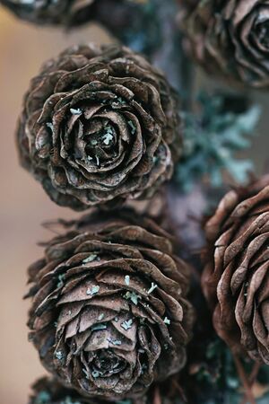 Beautiful brown round pine cones growing in the branches. Natural outdoors scenery of autumn park.