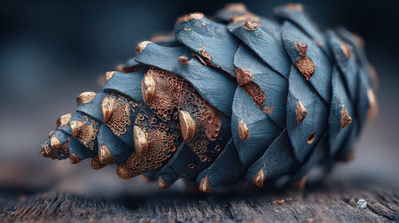 Capture the intricate details of a pine cone resting on wood, showcasing its unique textures and colors, perfect for nature and macro photography enthusiasts.