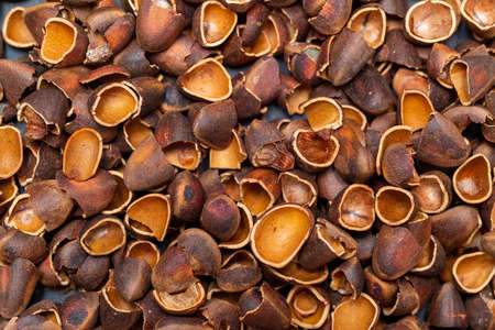 Background from shells from Siberian pine nuts, empty halves of nuts, top view close-up.