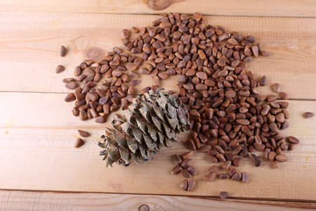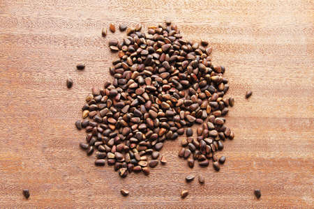 Pine nuts - small seeds of Siberian cedar pine, scattered on a wooden board.