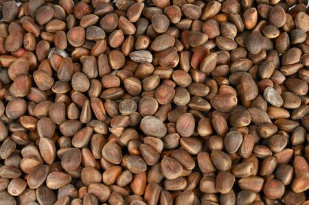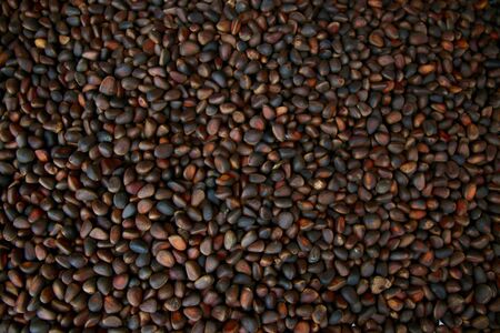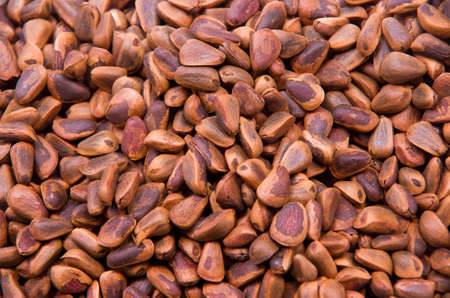 Abstract textured background from unpeeled pine nuts. Gifts of Siberia. Detox and cure for insomnia