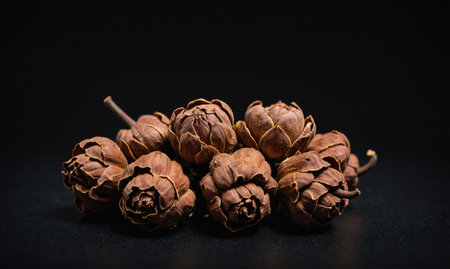 Capture the essence of nature with this detailed image showcasing wooden pine cones and seeds against a dark backdrop, offering a peaceful touch to seasonal decor.