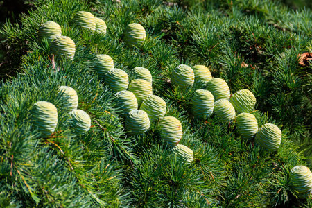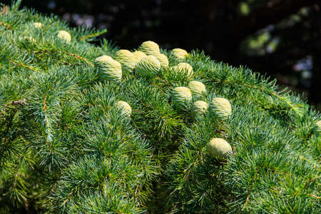 Young cones growing on a branch of a Cedar Tree (Cedrus libani) Cedar of Lebanon or Lebanon Cedar