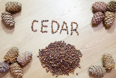 Pine nuts and cones lie on the table