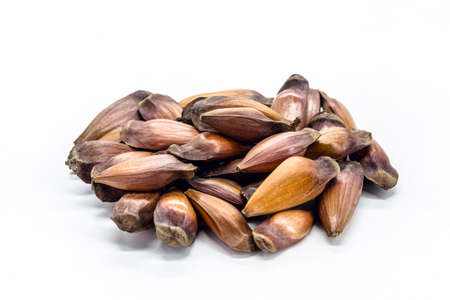 Brazilian pine nut seeds pile on isolated white background.