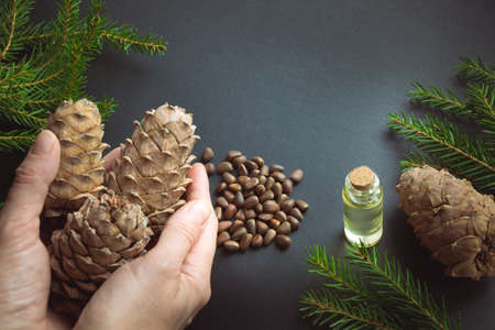 Cedar cone in female hand, branches and cedar oil on black background. Copy space.