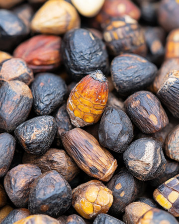 Heap of hard dark brown bean-like glossy seeds of cherimoya