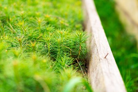 Conifers, young trees, green forest, trees in the forest by the sea. Blooming conifers in the spring