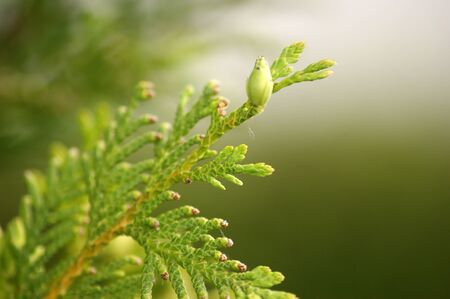 Small young cones on a thuja tree. Spring flowering. Green background with bokeh. Close-up, macro