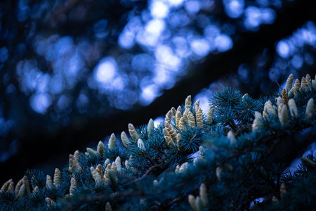 young branches of blue spruce with small buds of cones close-up texture for decor and design