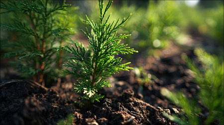 Cypress with small fresh leaves, growing upright in fertile soil, sunlight filtering gently, realistic textures, vibrant green tones, natural photography style, wide balanced composition for timelapse video.
