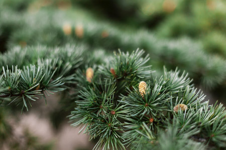 Spruce pine cedar fir fluffy branches with green needles prickles close-up, young brown cones. Evergreen trees nature christmas texture concept. Use for backdrop and banner.