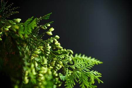 Tuya branch with cones close-up, abstract nature background. copyspace.