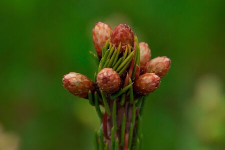 Spruce buds in spring. Pine buds. Christmas tree cones. Background spruce lumps.