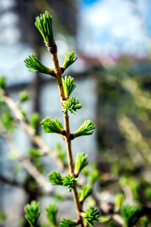 Branches with delicate green young larch needles, narrow focus area, early spring