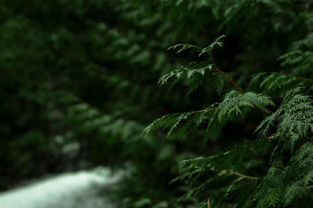 Coniferous twigs of thuja close-up, soft focus background