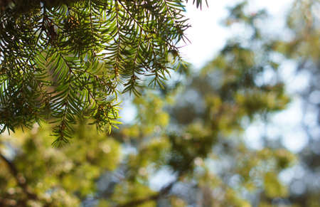 green pine tree in the forest, closeup of photo with soft focus