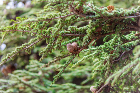 brown cones on branch of conifer tree on blured background