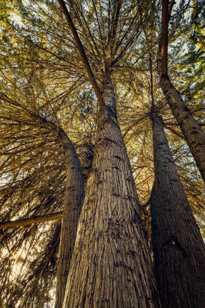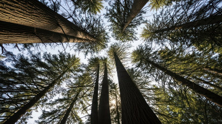 This image presents a low angle view looking upwards through tall trees. The trees' textures and green foliage contrast against the sunlight. The composition emphasizes the height of the trees and creates a sense of being in a natural environment during daytime.