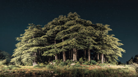 A panoramic wide view of Atlas cedar forest growing closely together under a clear night sky starlight illuminating leaves soft shadows calm natural atmosphere ultra realistic photography cinematic wide composition lifelike natural scene