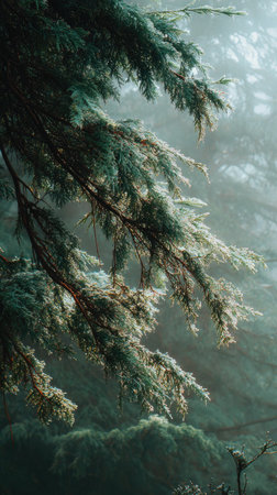 Discover the intricate details of an evergreen branch featuring lush green needles. This image captures the serene essence of nature and tranquility in the forest.