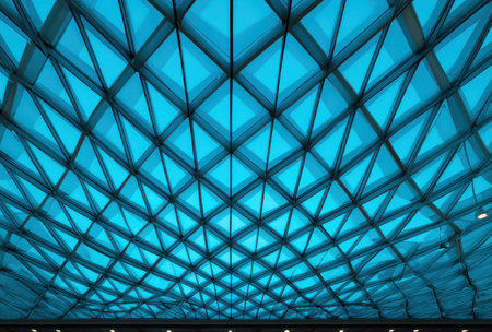 Geometric, teal-hued glass ceiling viewed from below, showcasing a complex, repeating pattern
