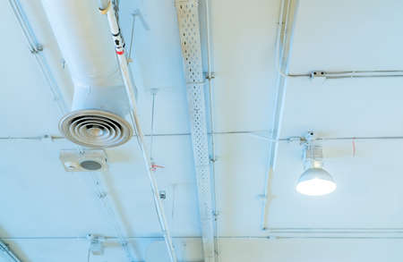 Air duct, automatic fire sprinkler safety system. Fire protection and detector. Fire sprinkler system. Building interior concept. Ceiling lamp light with opened light. Interior architecture concept.