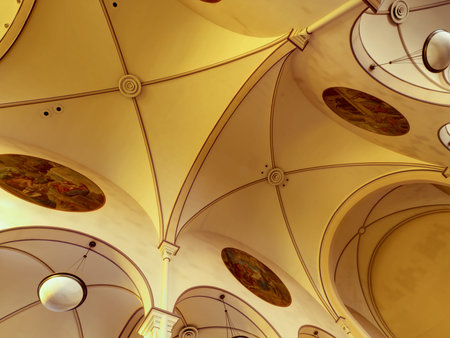 vibrant frescoes adorning a renaissance-style ceiling, created with generative ai