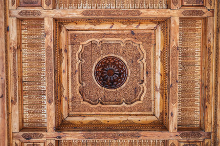 oriental pattern Uzbek traditional ornament on wooden carved ceiling in Tashkent in Uzbekistan