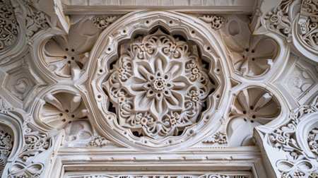 Exquisite white plaster work features detailed floral designs and a central circular motif. This craftsmanship highlights the beauty of traditional ornamental art in a serene setting.