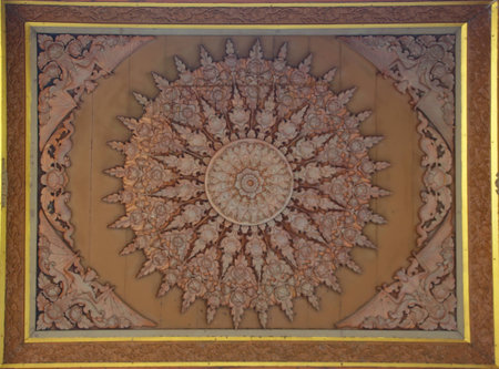 Discover the beauty of an intricately designed ceiling, featuring elaborate decorative elements and a warm color palette that enhances any interior space.