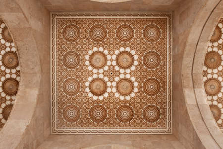 Beautiful ceiling with carved plaster decoration and marble walls. Architectural detail from the mosque Hassan II in Casablanca, Morocco.