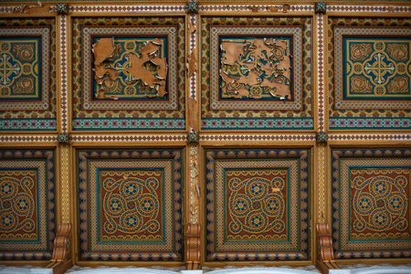 Lednice, Southern Moravia, Czech Republic, 04 July 2021: Castle interior with neo-gothic carved furniture, Details of a beautiful wooden ceiling with floral ornaments, UNESCO World Heritage chateau.