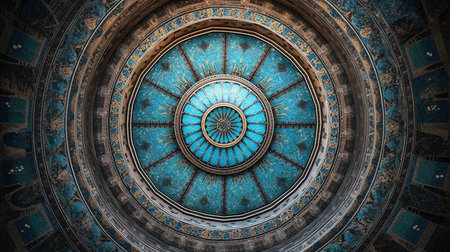 Explore the serenity of an intricately designed ceiling featuring ornate details and natural light from an octagonal skylight, creating a tranquil interior atmosphere.