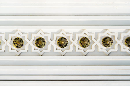White carved antique wooden doors with patterns, golden metal jewelry and mosaics. abstract background.