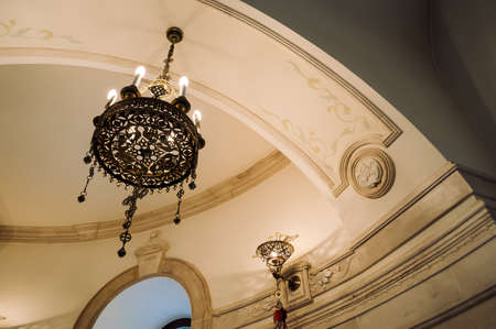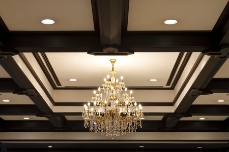 chandelier with downlight and warm white lamp on ceiling in the hall or hotel
