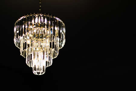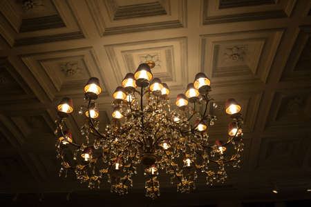 Close-up of a beautiful crystal chandelier Beautiful chandelier. luxury expensive chandelier hanging under ceiling