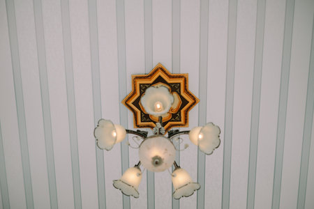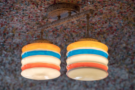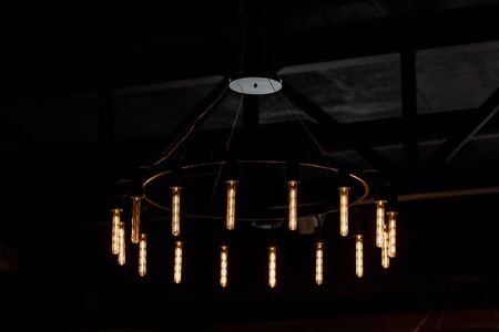 vintage light lamp interior in cafe or a living room. Loft and rustic style house interiors. Beautiful vintage luxury light lamp hanging decor glowing in dark